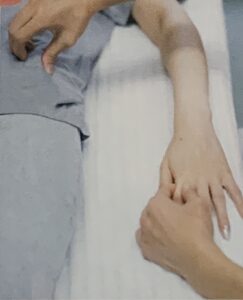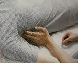 6.横向きになって頂いて、巻き肩の調整をしていきます。