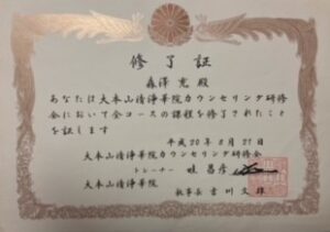2008年より、浄土宗のカウンセリング研究会にてNLP、ヒプノセラピー、ファミリーコンステレーションなどのサイコセラピーを学ぶ。