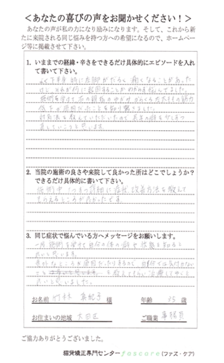 施術を受けて、右の親指のゆがみからくる左太ももの筋肉低下が原因だったことを知り驚きました。