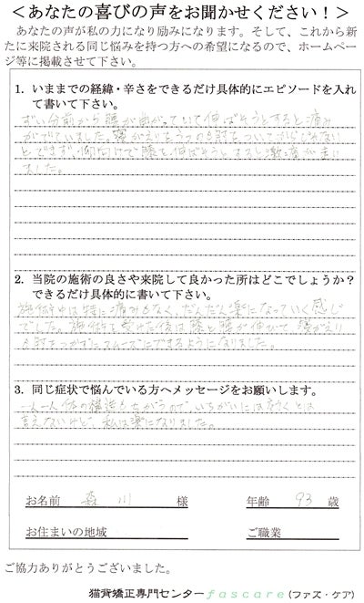施術を受けた後は、膝と腰が伸びて、寝返りも肘をつかずにスムーズにできるようになりました。