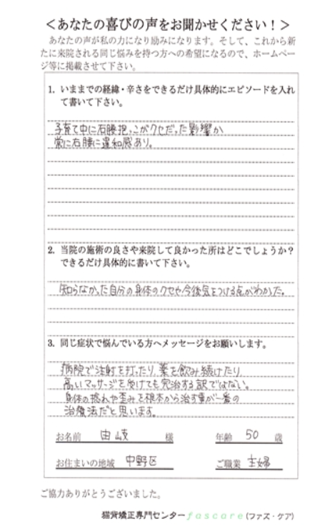 私は高校生の頃から腰が悪く、第五腰椎分離症と言われ、接骨院や整体やマッサージ等を色々受けたりして来ました。